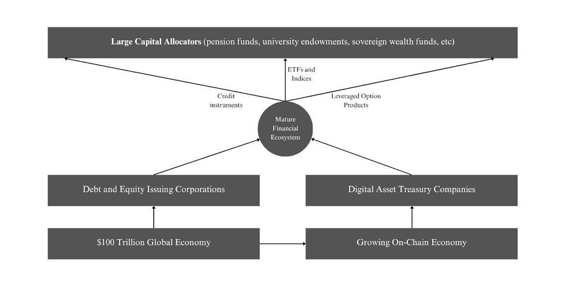 DATs fulfill a clear role in plugging the gap, providing the necessary vehicle for the financial system to ingest crypto and turn it into a variety of financial products for large capital allocators. This represents a win-win-win: