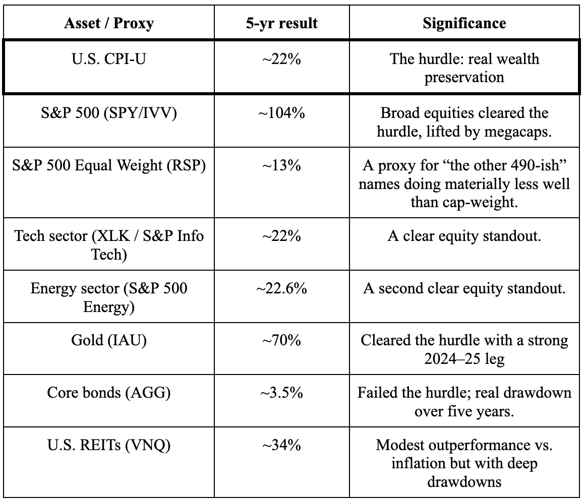 Let’s start at the top with macro (stock market macro, at least). The market has been doing well, the S&P 500 is up over 100% cumulatively over the past 5-years. But top-line nominal returns across asset classes hide the fact that only a few sectors are actually beating inflation. Over the last five years the price level rose ~22% (or ~4-5% annualized in CPI terms). In other words, for wealth to tread water in real terms returns have had to clear a ~ 4-5% annualized hurdle, ~20% cumulative, over that period.2