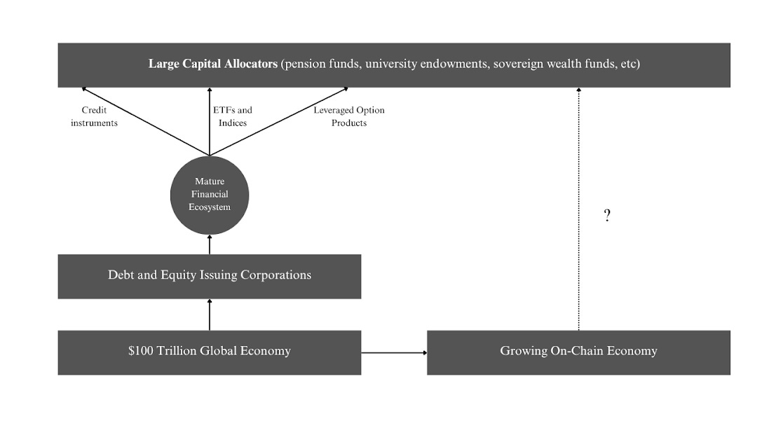 Roughly speaking, as blockchain adoption increases value accrues to BTC and ETH. This is key; return is increasingly embedded in assets (BTC/ETH) rather than operating companies. The old financial plumbing was not built for this. In the corporate world, it’s easy to build indices, credit ladders, and options structures on top of a company’s equity/debt. In crypto, the underlying upside sits in non-corporate assets. Thus, the access-to-crypto problem: