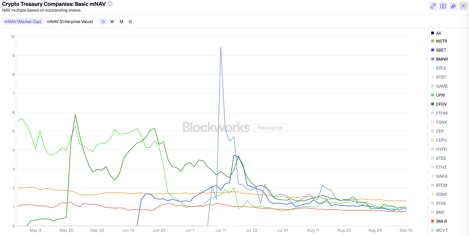 In the past couple months we have seen mNAV multiples consolidate and compress. Clearly, the market appetite for DATs has tempered and it remains to be seen what will happen going forward. At Republic, we believe mNAV cycles are cyclical in the same way P/E cycles are. When BTC and ETH make strong upward movements, market appetite will follow and mNAV multiples are likely to enter elevated zones. In less bullish markets mNAVs will compress.