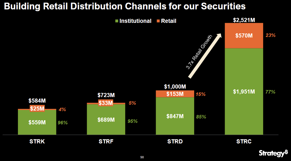 Additionally, being the most mature DAT company, Strategy has had time to scale and has started building its own capital stack on top of its equity. STRK, STRF, STRD, and STRC are credit-like instruments built on top of the common equity MSTR, and have become favorites of many large capital allocators. As shown in the July 2025 investor slide, these offerings have been oversubscribed, with demand led by institutions and a rising retail share, an early taste of how a crypto balance sheet inside an issuer unlocks manufacturable yield and duration.