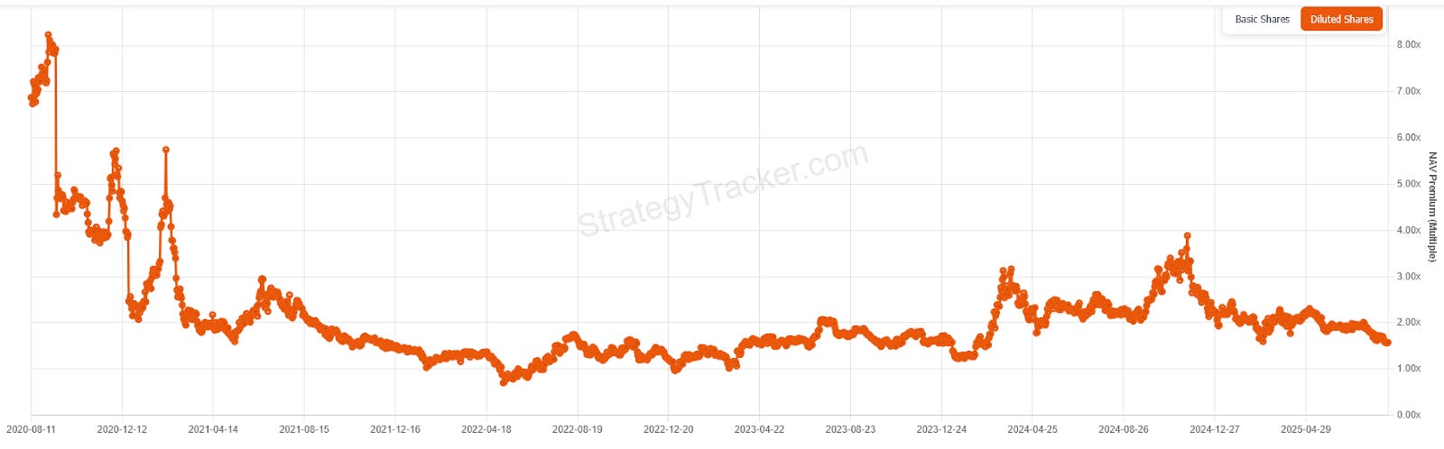 Big tech develops and sells products that generate cash flows; for DATs the balance sheet is the product and more specifically the increasing asset-per-share over time that DATs deliver. If a big tech company reports less than savory earnings indicating a declining demand in their products, their share price falls. Similarly if a DAT is unable to create sustained asset-per-share (see BTC Yield in terminology section) growth over time, its share price (and as a result its mNAV) will also fall.