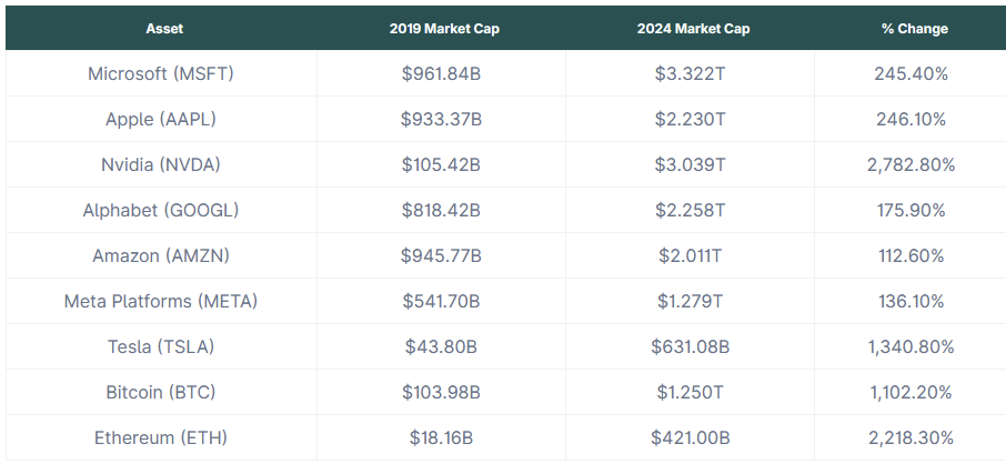 However, there is another asset class with outstanding real returns: crypto. In late 2024, BlackRock compared BTC to the Magnificent-73 and in fact BTC and ETH have both outperformed most of the Mag-7 over the past 5 years. The center of gravity for upside has started to shift on-chain4.